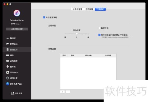 9、 支持平滑滚轮功能,使滚动操作更加流畅迅速,动静自如。用户可依个人习惯调节滚动速度,并能针对不同应用程序单独设定平滑滚轮的级别,提升使用体验。