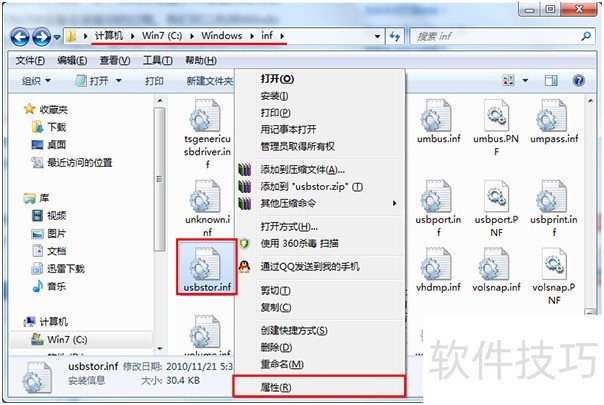 4、 启动电脑后,依次进入windows——inf文件夹,在其中查找usbstor.pnf和usbstor.inf两个文件。以usbstor.inf为例,将鼠标悬停在该文件上,点击右键,在弹出的菜单中选择属性选项,即可查看文件的相关信息。操作步骤清晰直观,便于后续处理。