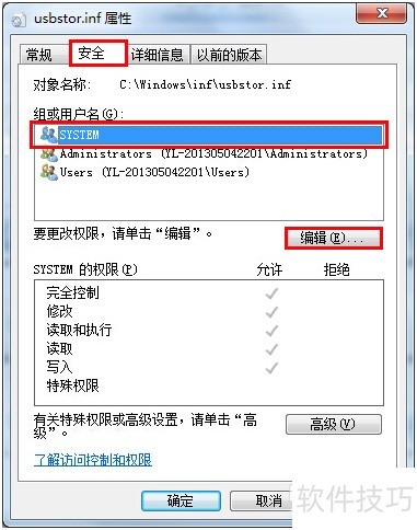 5、 在usbstor.inf的属性窗口中,切换至安全选项卡,选中组或用户名下的SYSTEM,随后点击编辑按钮进行操作。