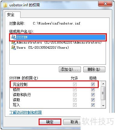 6、 在usbstor.inf权限设置窗口中,选中SYSTEM用户组,勾选完全控制对应的拒绝选项,然后依次点击应用和确定完成设置,具体操作可参考附图示例。