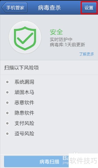 9、 进入病毒查杀页面,点击右上角设置按钮。