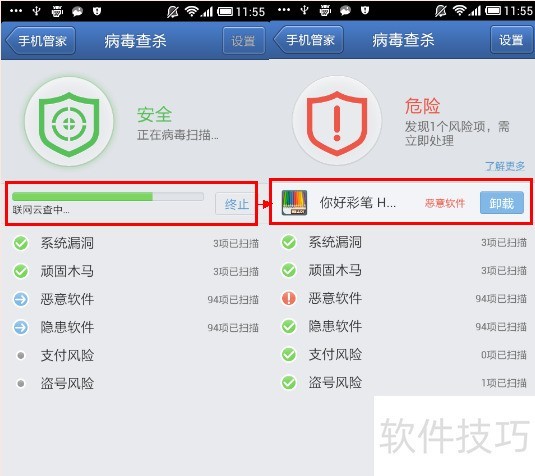 15、 若发现危险软件,及时点击卸载即可清除病毒。