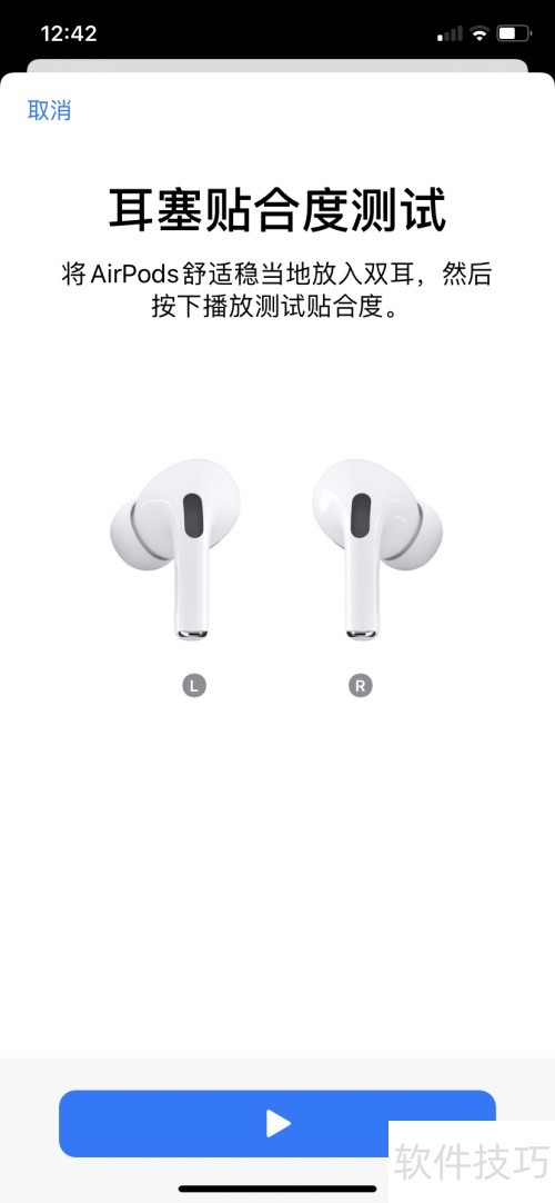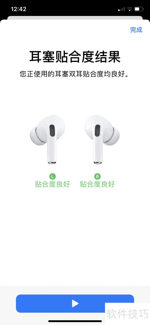8、 由于AirPods Pro采用入耳式设计,苹果特别加入了耳塞贴合度测试功能,操作十分便捷。只需通过蓝牙连接耳机后,进入设备设置界面即可启动测试。点击播放按钮,系统将自动播放一段音频,用于检测耳塞与耳朵的密合程度,确保佩戴舒适并达到理想的降噪效果。