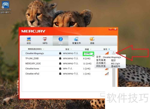 33、 在MERCURY 无线网卡客户端应用程序中,用鼠标左键依次点击1 (2.4G) (文本)。