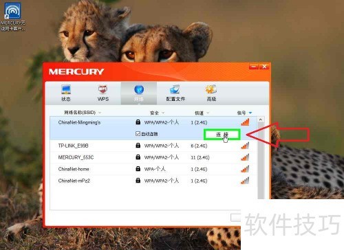 34、 在MERCURY无线网卡客户端应用程序中,点击Connect按钮。