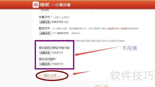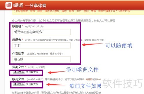 5、 歌名可自由填写,建议加入个人姓名以便搜索时便于查找,原唱信息也可随意填写,版本一栏可留空不填。