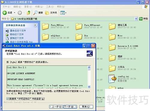 1、 可通过百度搜索下载所需软件Cool Edit Pro,下载完成后解压至当前文件夹。双击安装图标,启动本地安装程序。出现安装向导对话框后点击下一步,进入许可协议界面选择我同意,继续点击下一步,随后自定义安装路径并完成后续安装步骤。