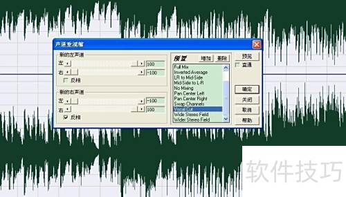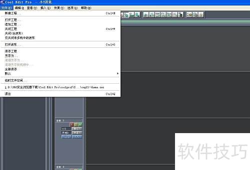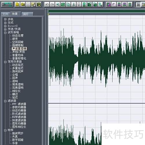 5、 此时可看到晚风mp3已导入软件(1),只需使用软件的效果功能即可实现去除原唱、保留伴奏。2所示,在选项中选择功能,即可完成操作。