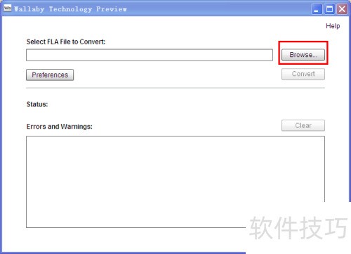 4、 界面所示,点击浏览按钮,选取后缀为.fla的已制作完成的Flash源文件。