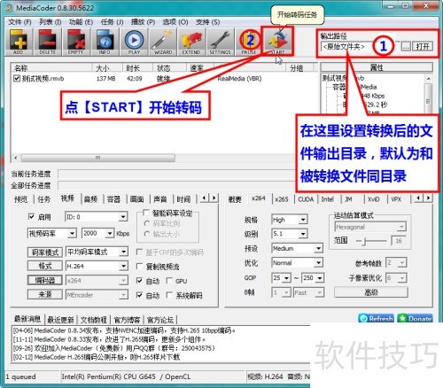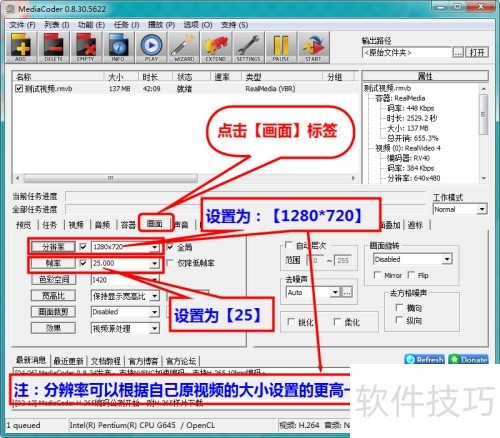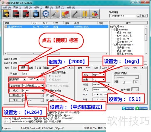 4、 完成添加后,即可进行设置,优先调整参数,建议适当提高视频码率,具体数值可参考原视频的码率情况。
