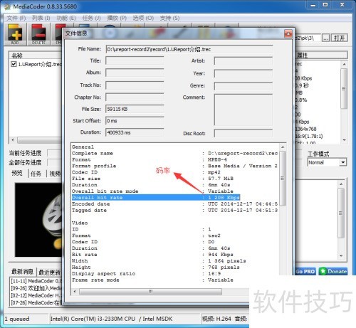 4、 点击后将显示视频参数列表,其中overall bit rate表示视频码率,具体所示。
