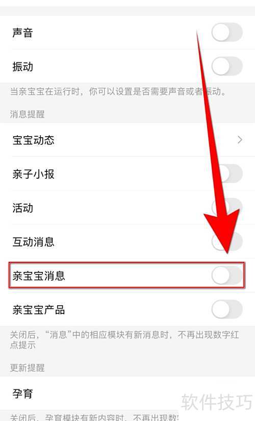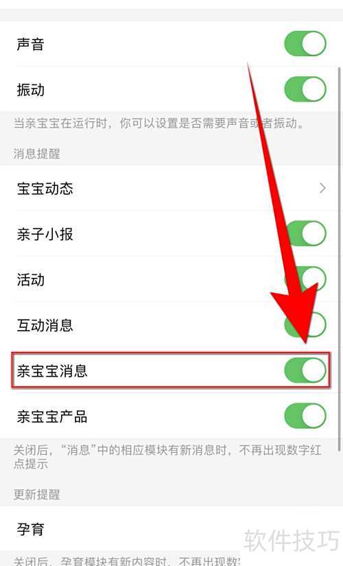3、 在设置页面点击亲宝宝消息右侧的圆点