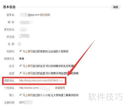 4、 打开基本信息页面后,可查找到新浪博客链接,点击即可跳转至博客页面。