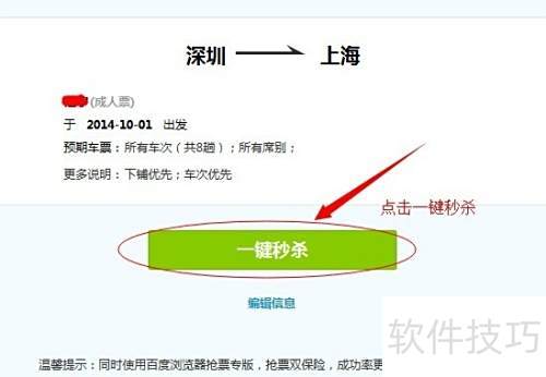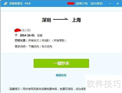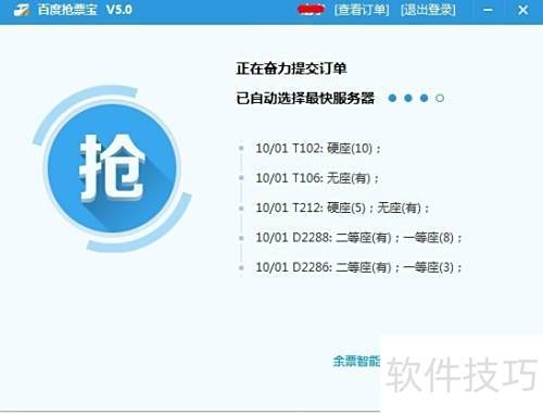 6、 随后点击一键秒杀,系统将进入自动下单购票流程(2所示),页面会显示当前车次的查询结果、座位类型等相关信息。
