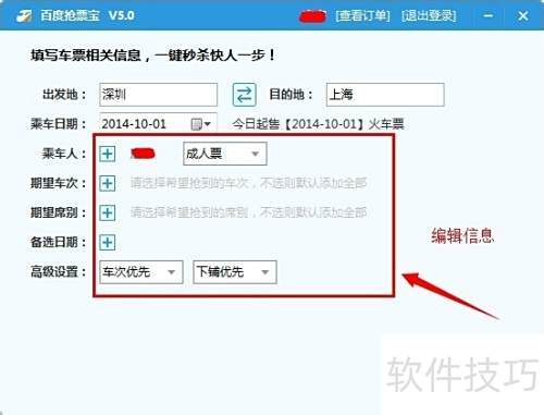 5、 在主页面点击编辑信息,按图2所示填写购票人资料,选择所需车次及理想席位,确认无误后点击我选好了即可完成操作。