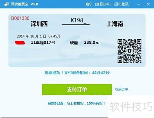 8、 页面显示即为抢票成功,登录12306官网完成支付即可。