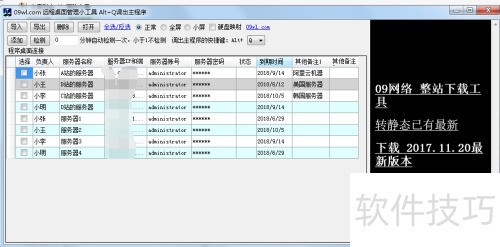 15、 使用者、服务器名、远程IP与端口、登录账号、密码、状态(自动检测)、到期日、备注信息