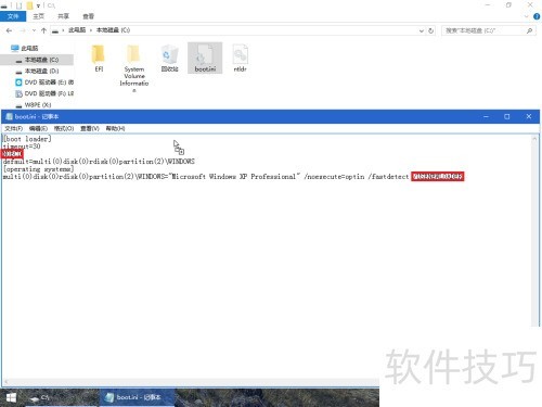 11、 进入FAT32分区根目录,打开boot.ini文件,添加指定参数即可。
