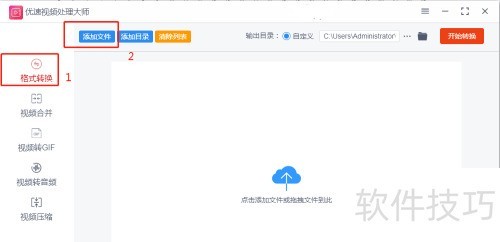 1、 首先启动电脑,运行优速视频处理大师2.0.2.1,选择界面左侧的格式转换功能,点击添加文件按钮,将需要转换的FLV视频逐一导入,软件支持批量添加,方便高效地将多个FLV文件统一转为MP4格式。