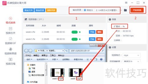 3、 第三步:完成设置后,在顶部右侧指定输出目录,点击右上角红色开始转换按钮启动转换。当FLV文件成功转为MP4格式后,系统将自动打开预设的保存文件夹。