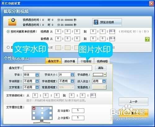 4、 导入需要添加水印的FLV视频,进入其他功能设置界面后,即可进行水印添加操作。在下方的叠加文字选项卡中可添加文字水印,选择个性商标选项卡则可添加图片水印。每个选项卡均提供丰富的参数调节功能,包括水印的显示时段、位置布局、透明度、字体样式或图片大小等,满足个性化需求,操作便捷,功能全面,确保水印效果精准符合预期。