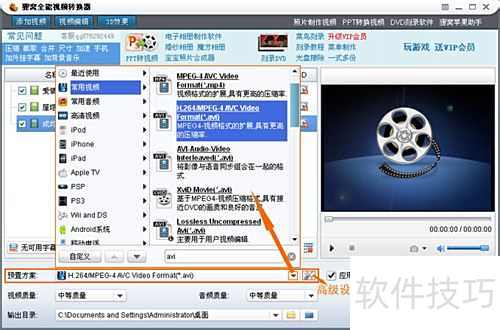 2、 选择合适的转换格式。点击预置方案右侧的下拉箭头,打开菜单后从中挑选所需的AVI格式。由于AVI格式种类较多,具体选择应根据转换后视频的用途或播放设备的支持情况来决定,包括设备所兼容的格式类型、编码方式、分辨率及帧率等参数,确保视频能在目标设备上顺畅播放。