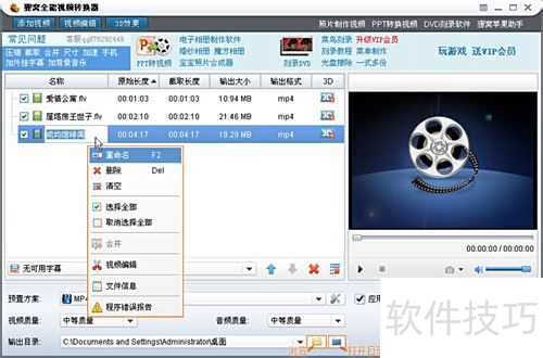 3、 可右键点击列表中的视频文件进行重命名。在主界面底部设置输出目录,指定转换后视频的保存路径。同时可调整其他功能选项,并自定义输出文件名称。