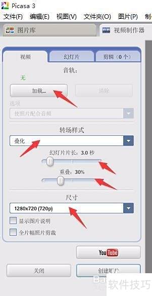 6、 进入视频选项,挑选喜欢的转场效果,设定每张照片的显示时长、切换时间、重叠程度,并选择合适的视频分辨率。可点击加载添加背景音乐。全部设置完成后,点击创建影片即可生成专属视频。