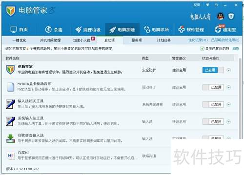3、 若此处未找到,可检查优化软件的启动项设置,如电脑管家的电脑加速功能,进入启动项管理,将已启动项点击切换为已禁用状态即可。