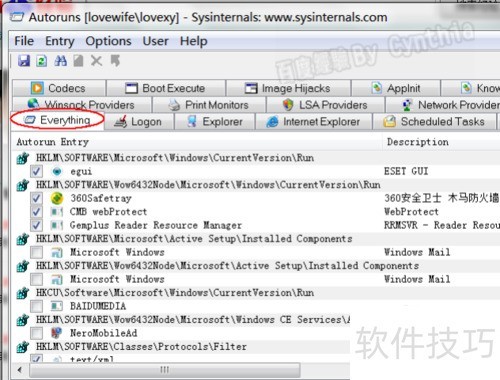 4、 启动autoruns工具后,稍等片刻,系统将自动进入Everything标签页,展示所有启动项与加载项信息。