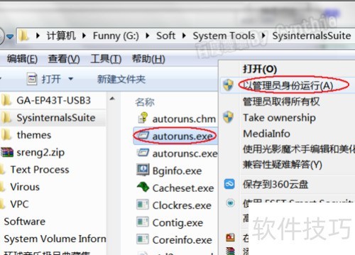 2、 以Windows 7系统为例,右键点击autoruns工具,选择以管理员身份运行即可。