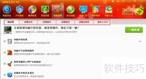 10、 打开360等清理软件,运行全部清理功能,彻底清除系统中的垃圾文件。