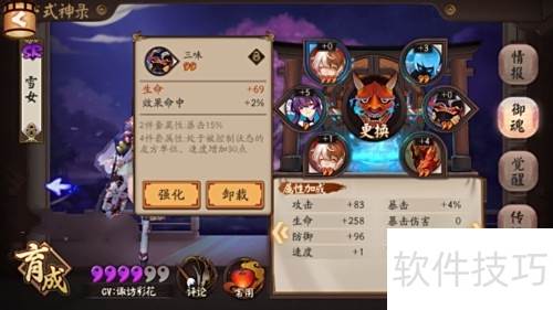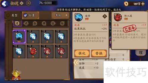 6、 准备4至6星御魂,通过升级、升星和强化提升其速度属性。