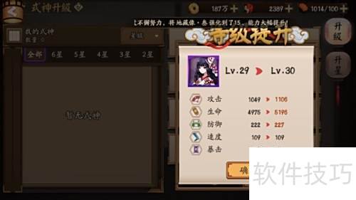 5、 随着式神等级提升,角色各项属性也随之增强,玩家可通过升级式神,有效提高角色的行动速度与整体实力。