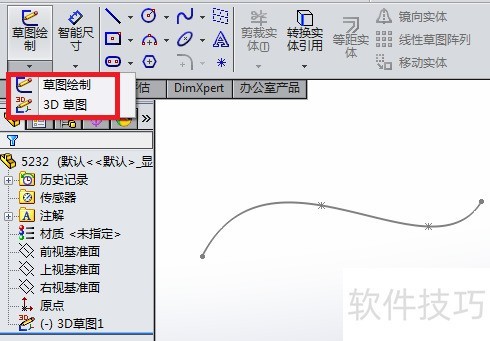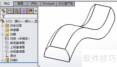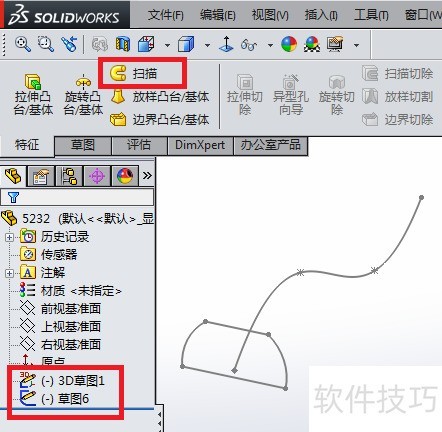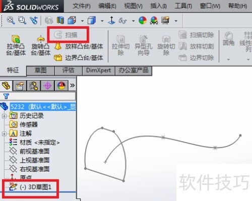 1、 所示,当前仅有一个草图。尽管轮廓与扫描路径均已绘制,但扫描功能要求两者必须分别位于不同草图中,无论采用2D或3D草图。因此,要启用扫描命令,至少需要创建两个独立草图。