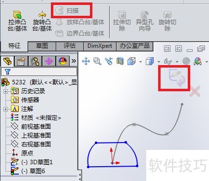 6、 扫描命令需在退出草图编辑状态后方可使用。中正处于轮廓草图绘制模式,必须完成草图绘制,点击右上角确认按钮退出后,才能执行扫描操作。