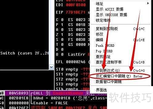 7、 选中调用EnableWindow的代码行,右键点击,选择反汇编窗口跟随,操作所示。
