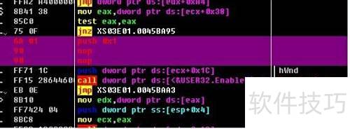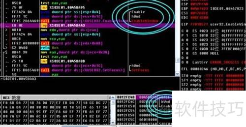 8、 此时观察反汇编窗口,可发现EnableWindow函数的两个传入参数。