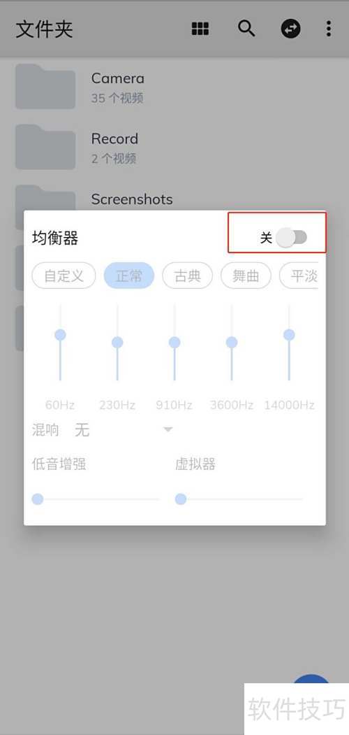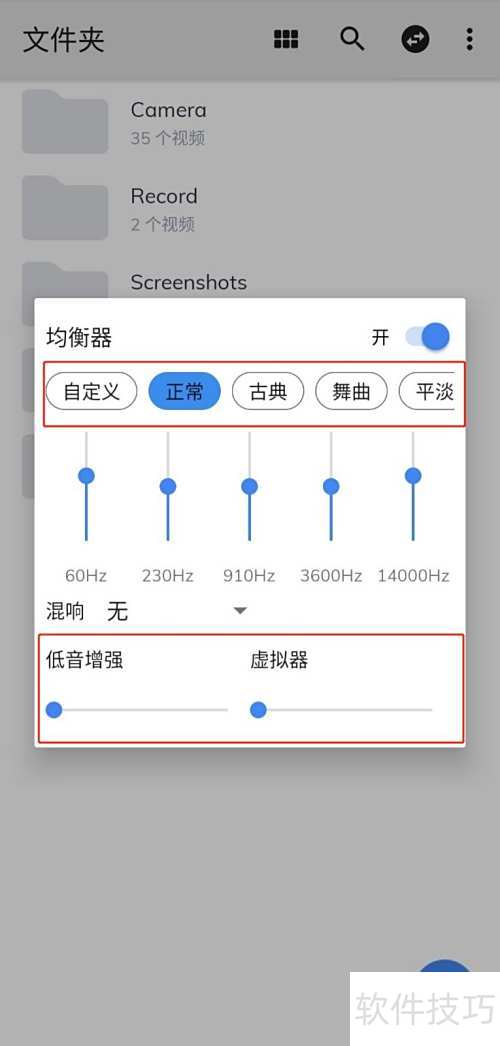 5、 开启均衡器后,可根据个人偏好调节音效,自由选择不同音色风格,或启用低音增强等功能,打造专属听觉体验。