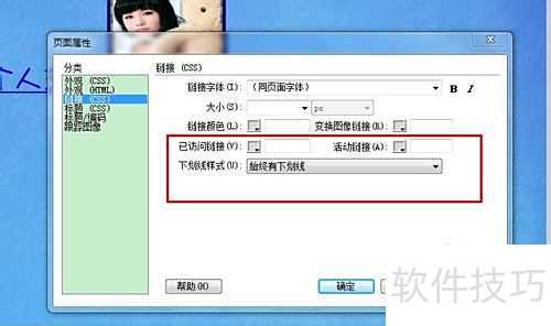 16、 进入页面属性,选择链接选项,设置已访问链接及其下划线样式。