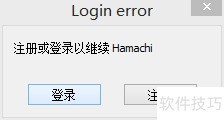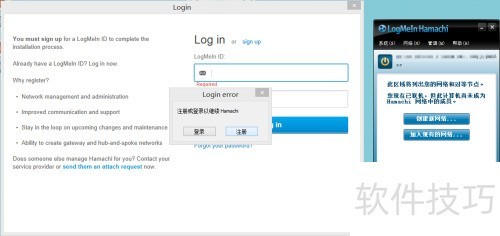 24、 旧版Hamachi在创建网络时会提示错误,原因是未关联LogMeIn账号。请升级至最新版本,然后依照连接启动的步骤完成网络连接操作,即可正常创建和加入网络。
