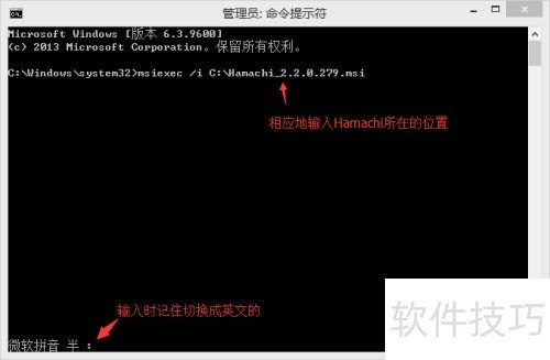 6、 在命令行提示符中输入:msiexec /i C:Hamachi_2.2.0.279.msi,注意空格且使用英文标点,即可通过管理员权限启动安装程序。