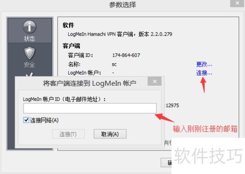 12、 注册并完成邮箱验证后,登录Hamachi后台。打开Hamachi客户端,依次点击系统→参数选择→连接,输入刚注册的账号信息,点击连接即可完成设置。