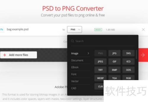 11、 前往convertio.co网站,将需要处理的PSD文件拖拽至页面任意区域即可上传。系统会提供多种格式供您选择转换目标类型,选定所需格式后点击转换按钮。平台将自动完成文件转换过程,确保操作安全可靠。转换完成后,点击下载按钮获取处理后的文件,随后可使用设备默认的图像查看软件打开并查看该文件内容,操作简便快捷,适合快速转换需求。