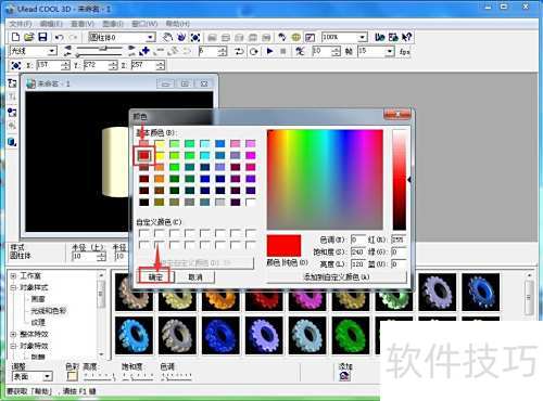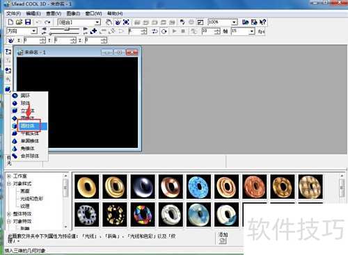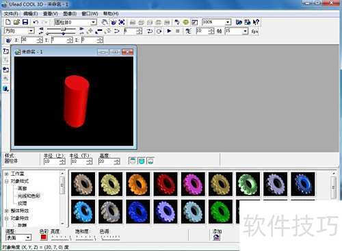 在Ulead Cool 3D中可制作多种几何图形,下面介绍如何创建一个红色的圆柱体。通过选择基本形状工具,设定颜色为红色,并调整参数即可完成。