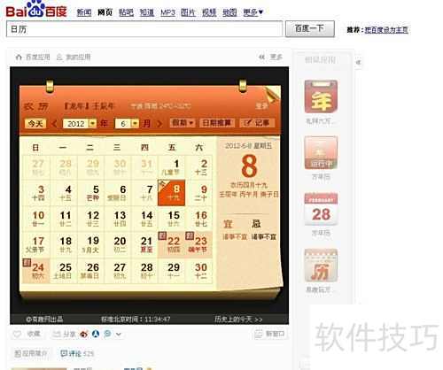 2、 在百度搜索栏输入日历并搜索,网页中将直接显示日历信息。