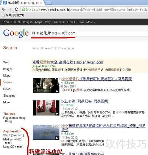 3、 如需按视频来源网站精准筛选纪录片,可使用谷歌视频搜索,操作方法2所示。