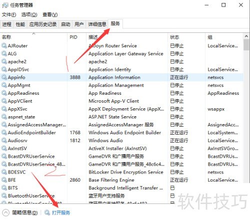 2、 打开任务管理器,点击服务选项,再选择打开服务即可。
