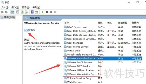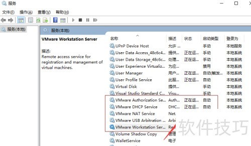 3、 进入服务界面,查找与VMware相关的五个服务,依次启动,具体操作所示。