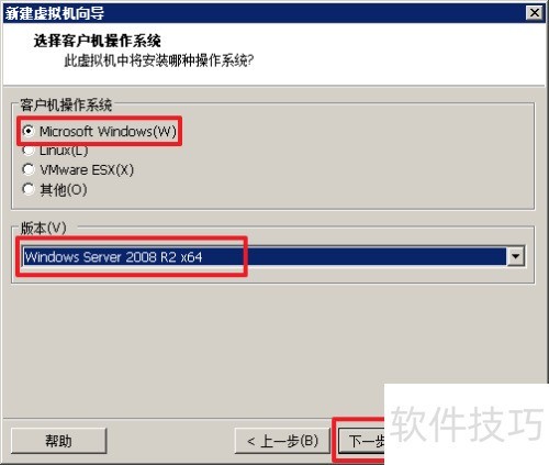 5、 选择客户机操作系统为Microsoft Windows,版本为Windows Server 2008 R2 x64,确认无误后点击下一步继续操作。